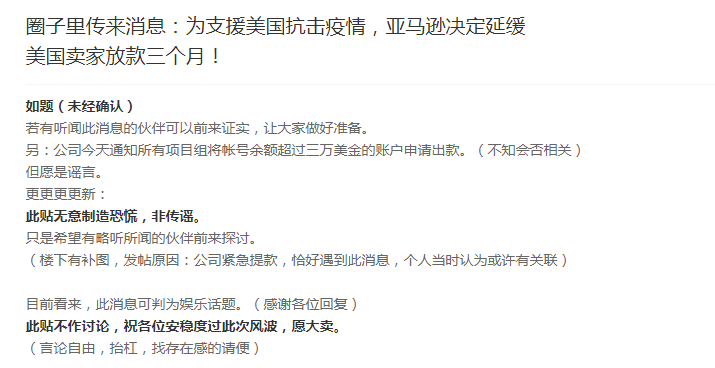 并且我还在看到了一个小道消息,据说亚马逊即将延缓三个月放款。