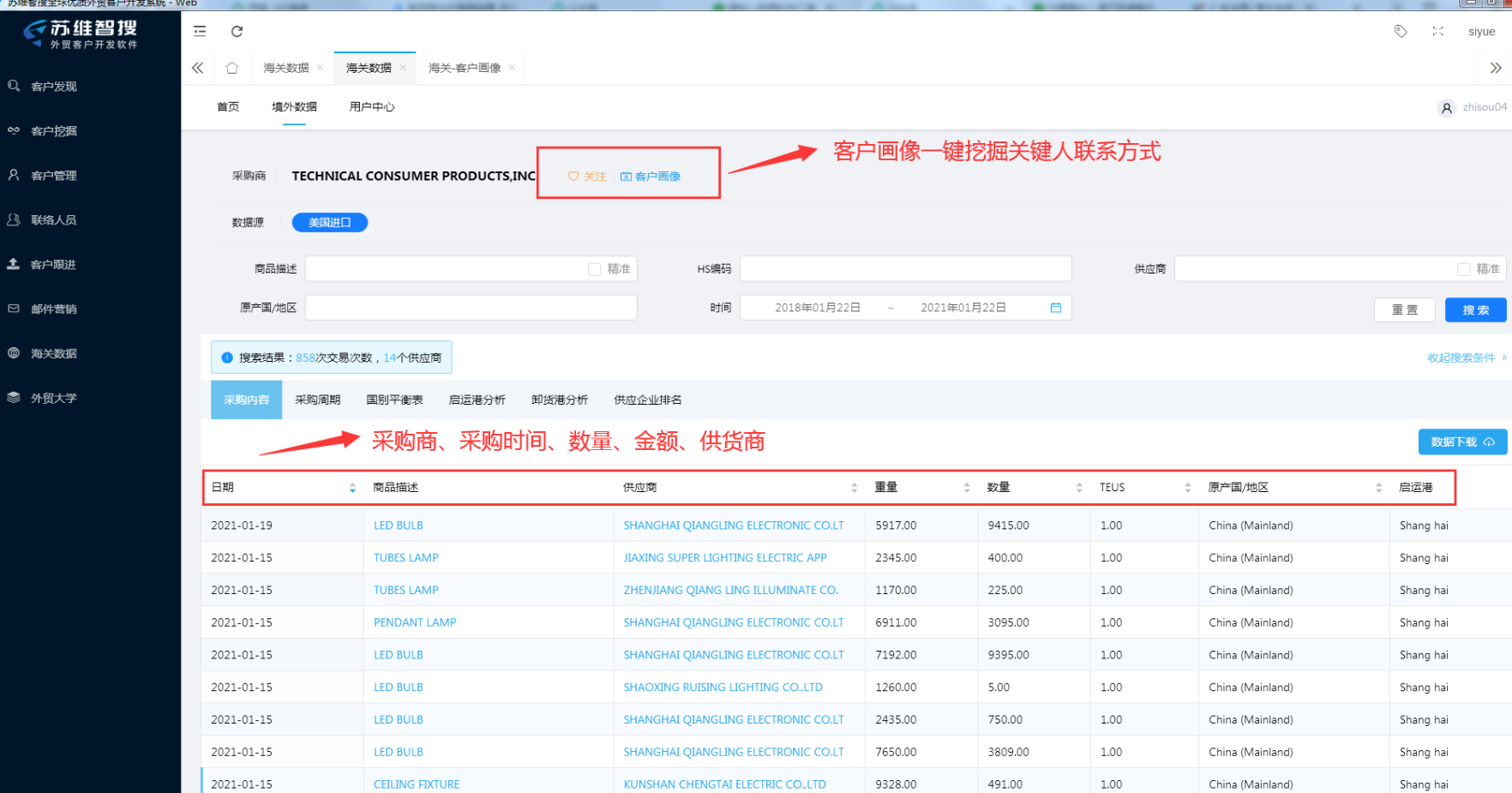 不仅可以查看客户的采购周期、采购量、采购金额,进一步判断询盘质量和客户的真实采购意图,还能摸清该客户正在合作的国内同行,从而帮助我们更好地找准自身优势和客户痛点,有针对性地制定营销策略,大大提高询盘转化率。
