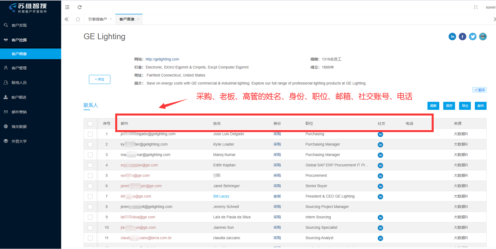 这时候,我们可以借助外贸客户开发软件,比如苏维智搜的客户画像功能,输入公司名称或网址一键获取,对方是老板,是采购,还是高管,即刻一目了然。