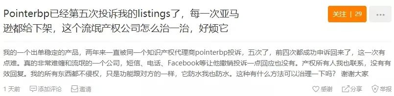 帖子发出去不久,下面就有不少卖家回应,自己也遇到了相同的情况,listing都被投诉侵权下架了。