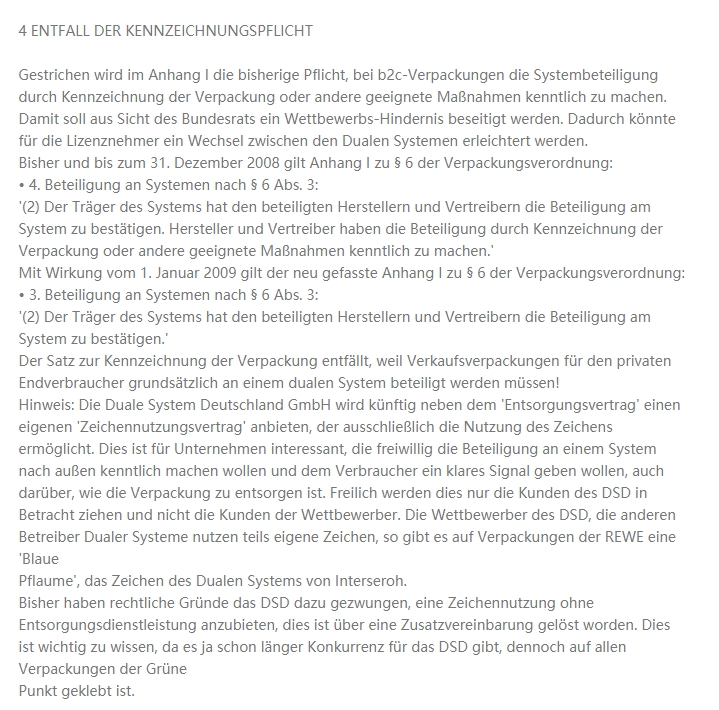 目前几乎所有的文章都强调,卖家需要把三个箭头的回收标志贴在包装上;而事实上,德国早就废除了这个义务。根据德国《包装法》第5次修订,从2009年开始就没有义务印刷回收标志了,但是必须印企业的地址信息。
