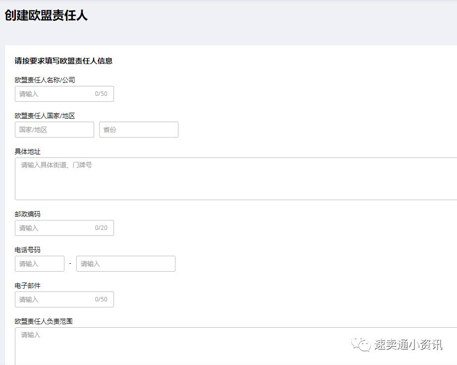 需填写欧盟责任人名称/公司、地址(需位于欧盟境内)、邮编、电子邮件和电话号码。
