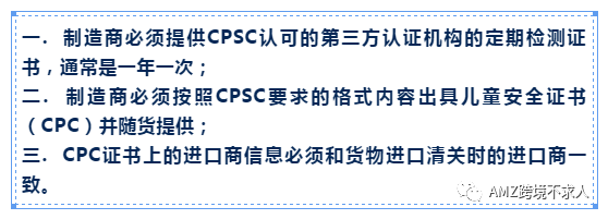 特别注意的是上述第三个要求,很多跨境电商卖家借用第三方的IOR(进口商)在美国清关,这会造成进口清关时的进口商和CPC证书上的进口商不一致,也就是即使提供了CPC证书和第三方检测报告,CPSC仍然会以进口商不一致为理由扣留货物。