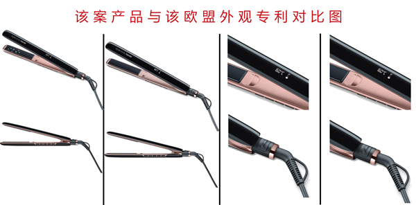 第二它们在立体图中的整体形状都为夹状的长方体;主视图中的整体结构都是由两个相同的长方体组成的夹状物体,且在开机后表面都有实时的温度监测设备;侧视图中相同的构件为五个调节温度的按钮。由此可以基本证明该案产品已经申请欧盟外观专利并且通过了授权。