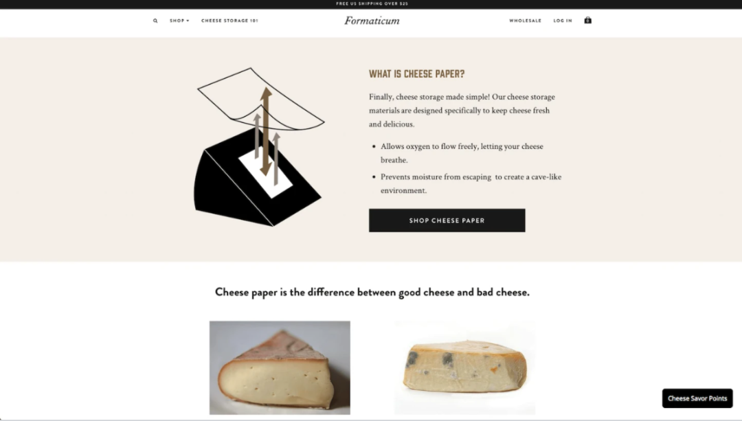 作为一个专门销售奶酪保存纸的站点,Formaticum在页面展示了产品的使用场景和使用方法,并通过图片的形式,专门强调其产品对奶酪保存的重要性。这是展示产品可用性的一种有趣而有效的方法。