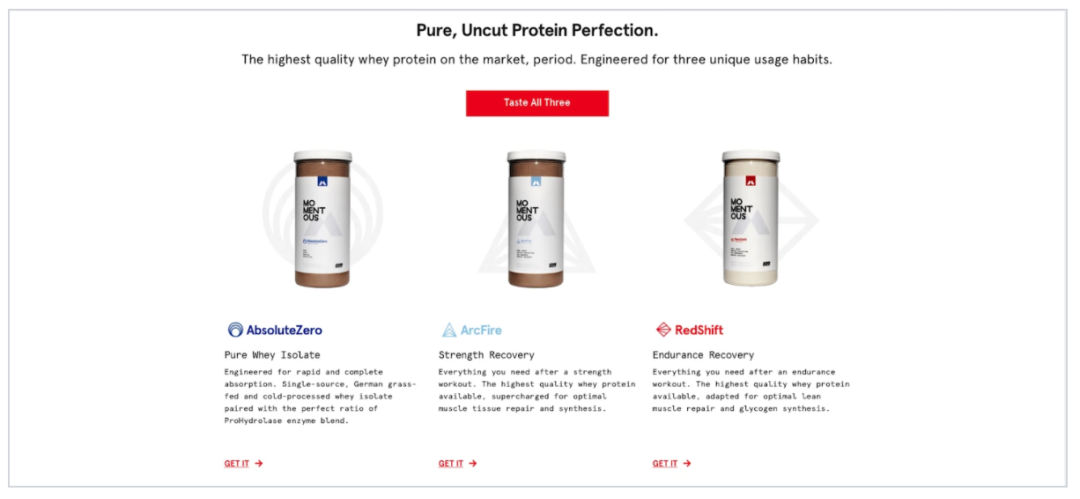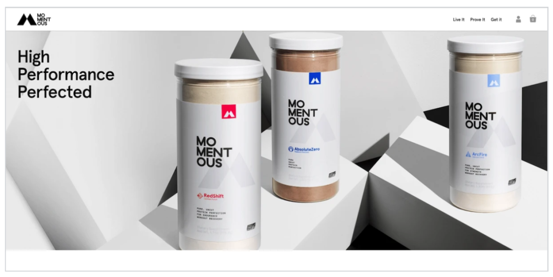 Momentous销售的主要是营养补充剂。他们在网站主要采用了白色和米色的配色,并通过添加鲜艳的色彩使他们的品牌和产品看起来干净整洁,使简单的产品也具备了令人难忘的特点。