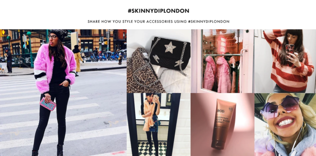 SkinnydipLondon在页面展示了大片自己的Instagram账户的内容,这些照片包括产品原始图片、用户使用场景、以及用户自己发布的照片。他们还在标签上还加入了一个微妙的号召性用语,鼓励人们分享自己的照片,从而获得可能被展示的机会。