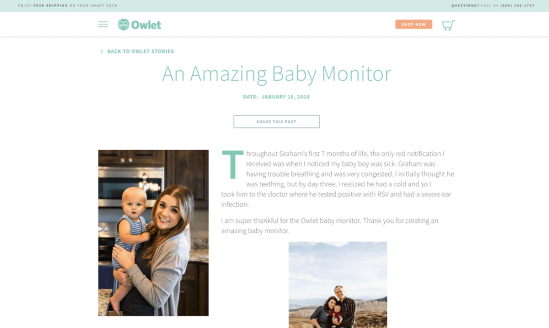 Owlet在其网站上专门设立了一个“Owlet故事”栏目,用于展示客户得使用感受、产品评价以及小朋友们的照片,通过这个方法Owlet成功吸引了众多客户,并获得越来越多客户的信任。