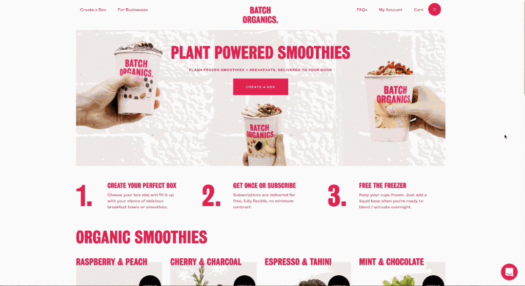 同样是利用悬停图片效果,Batch Organic则是展示产品从成分转变到最终产品时的效果,以此达到刺激买家垂涎的效果。