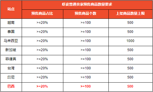 巴西站点现有的非优选和非商城店铺将被限制上架商品数量至5000个;优选店铺可以上架10000个商品;商城店铺可以上架20000个商品。
