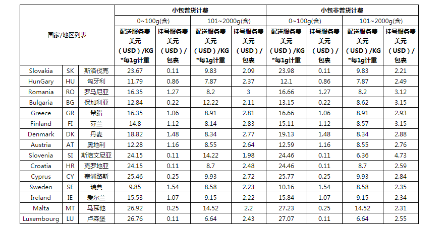 为丰富速卖通线上发货物流渠道,给卖家提供更多发货选择,自美国西部时间2021年5月27日起,“AliExpress无忧物流-简易”将开通发往法国、斯洛伐克、匈牙利、罗马尼亚、保加利亚、希腊、芬兰、丹麦、奥地利、斯洛文尼亚、克罗地亚、塞浦路斯、瑞典、爱尔兰、马耳他、卢森堡国家的线路,覆盖0-8美金商品,赔付上限为60元人民币。新线路运费报价如下: