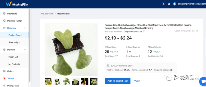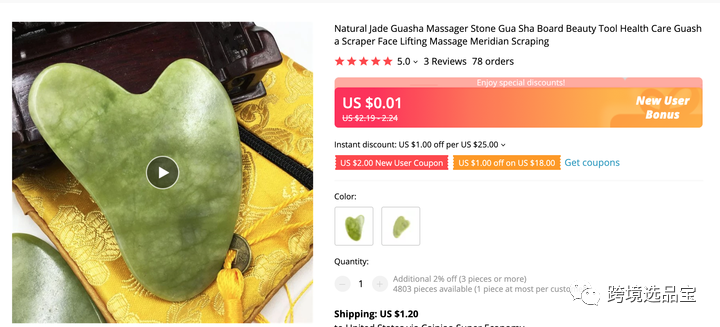 51Niche 搜出来的速卖通增长趋势比较猛的刮痧产品是玉石类脸部刮痧工具。其余一些有增长趋势的电动刮痧工具看了下发布时间比较久,很可能是被这一波热度带了下,销量才往上走了一段。