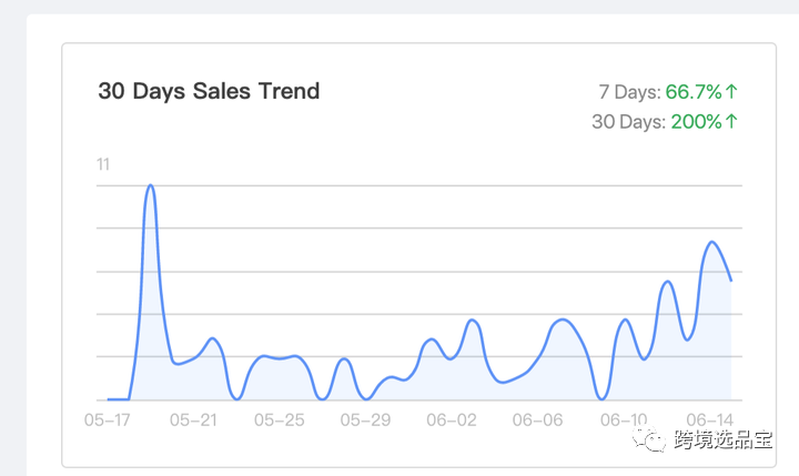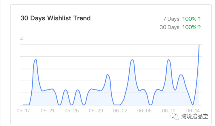 如下图,根据 51Niche 的产品分析数据显示,该产品2021 年5月11发布,目前总销量77,30天销量趋势图和wishlist的趋势图都是上升趋势,7天增长率66.7%↑,30天增长率200%↑,增长趋势都是相当明显的。