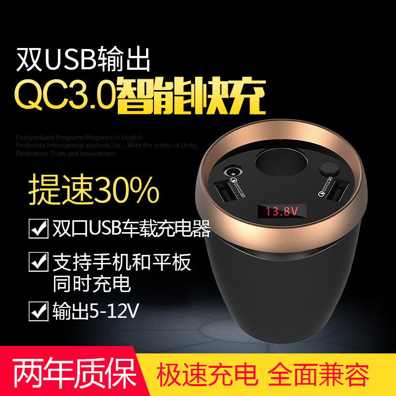 爆款新品多功能胎压卡槽杯充QC3.0快充车充杯双usb车载充电器
