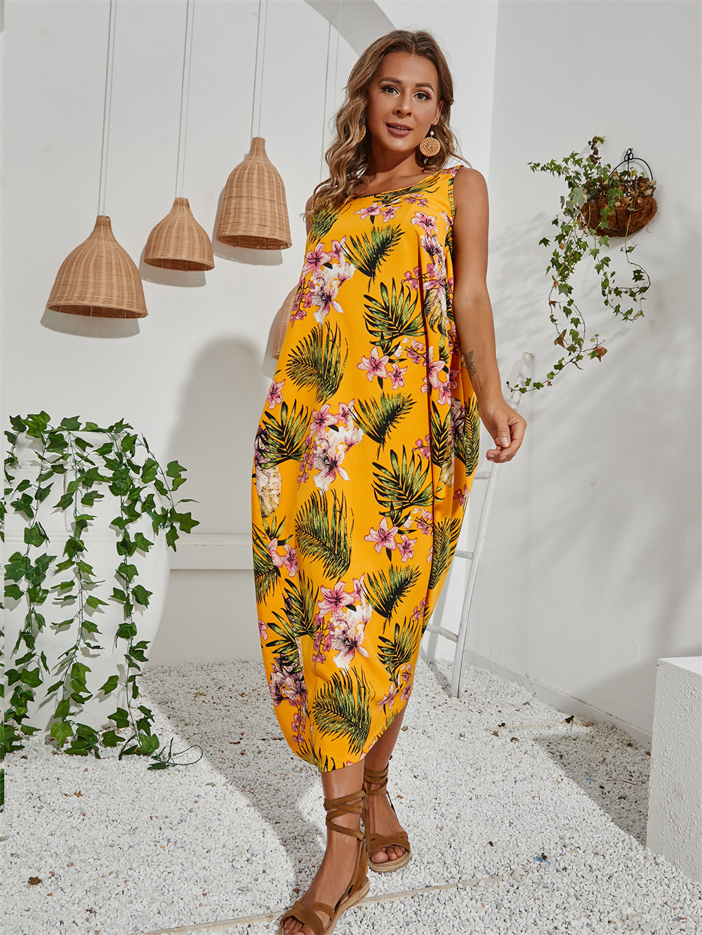 亚马逊wish欧美跨境新款夏季无袖印花松紧腰显瘦不规则连衣裙