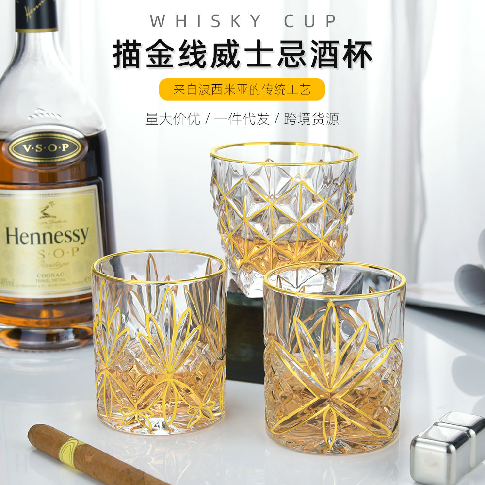 欧式水晶玻璃加厚威士忌酒杯 轻奢典雅描金威士忌玻璃杯 创意酒杯