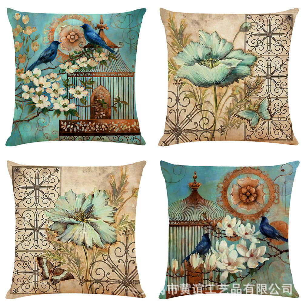 亚马逊 eBay 跨境新款艺术花鸟图案棉麻汽车抱枕套办公室午睡抱枕