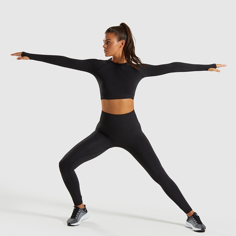 纯色运动跑步吸汗健身服亚马逊透气瑜伽服长袖速干衣瑜伽服套装女