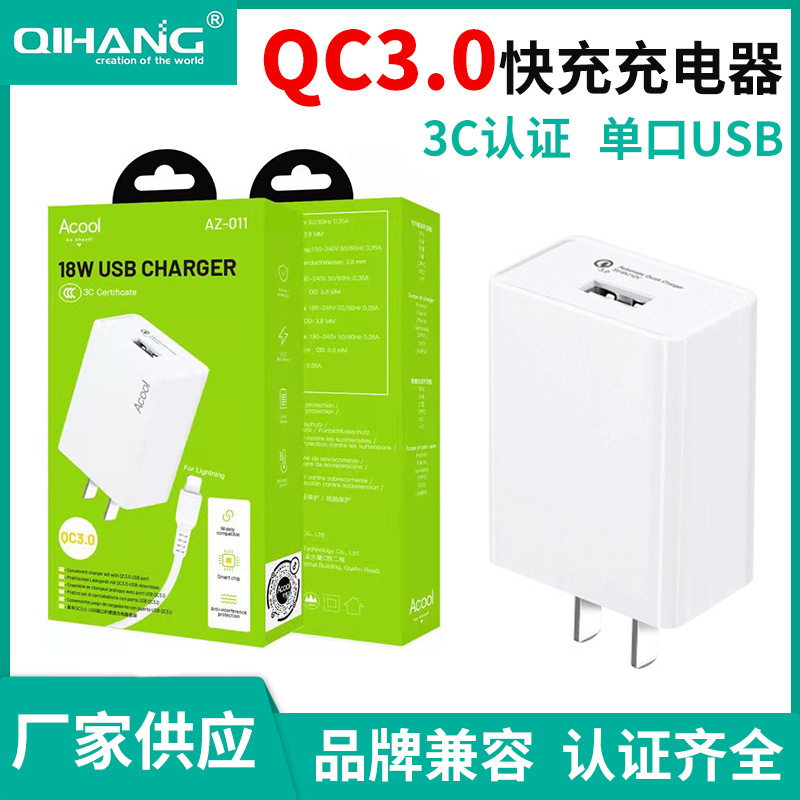QC3.0快充充电器电源适配器中规3C认证单口USB充电头闪充充电器