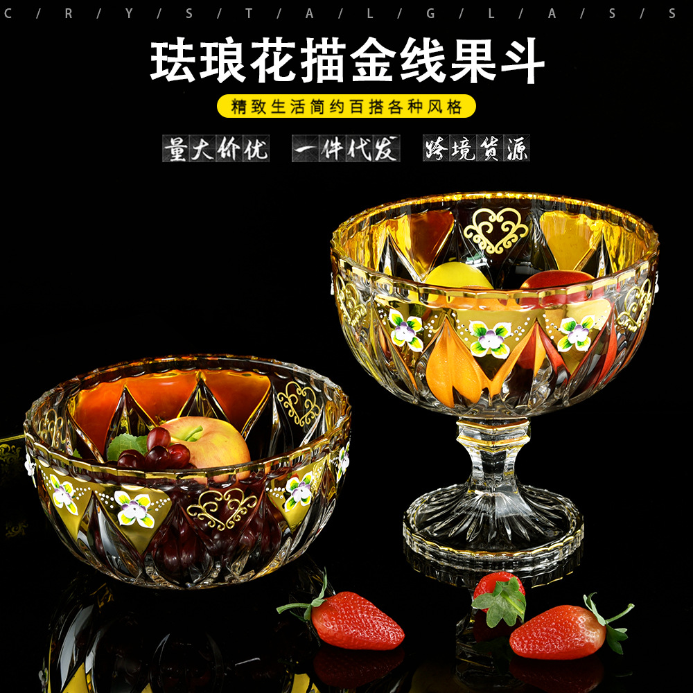 珐琅花描金线果斗捷克宫廷风高脚果斗轻奢复古大尺寸水晶玻璃果斗