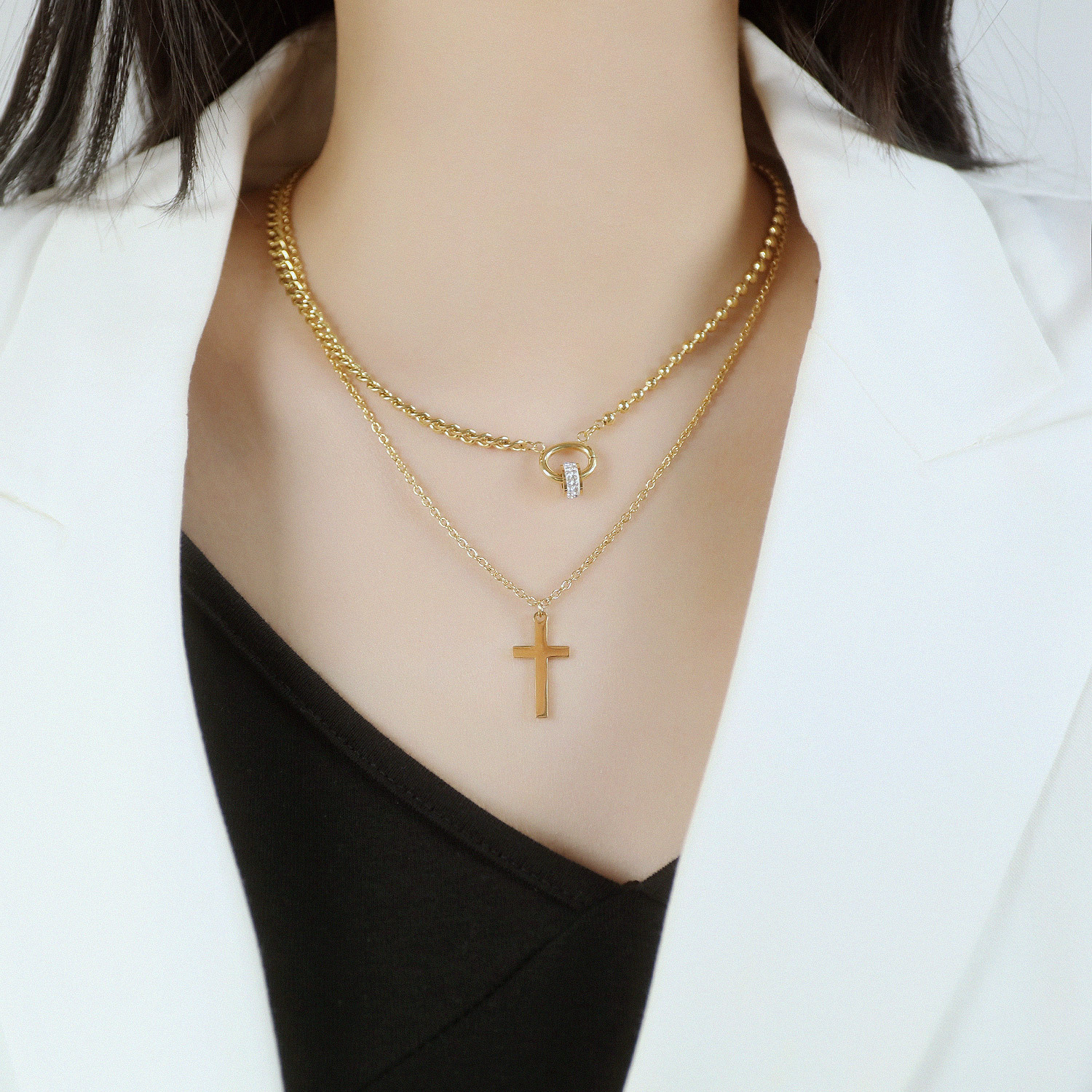 欧美跨境饰品 复古ins风十字架锁骨链 ins潮圆环双层钛钢项链女
