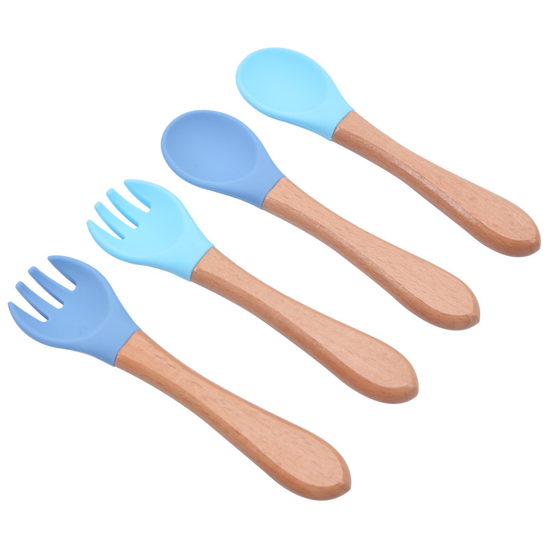 【厂家现货】木柄硅胶勺子叉子 宝宝硅胶叉勺餐具套装批发