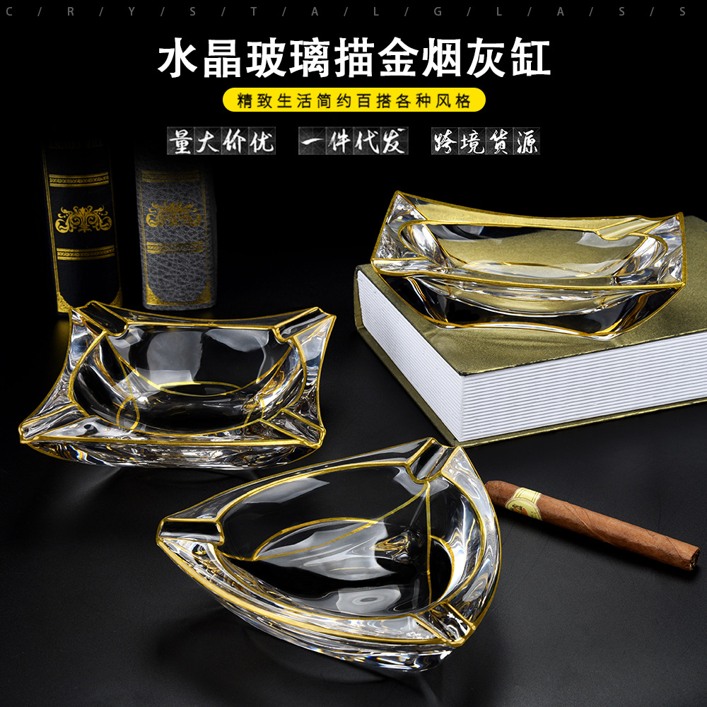 跨境雪茄烟缸水晶玻璃描金烟灰缸办公室客厅家居摆件大号烟缸批发