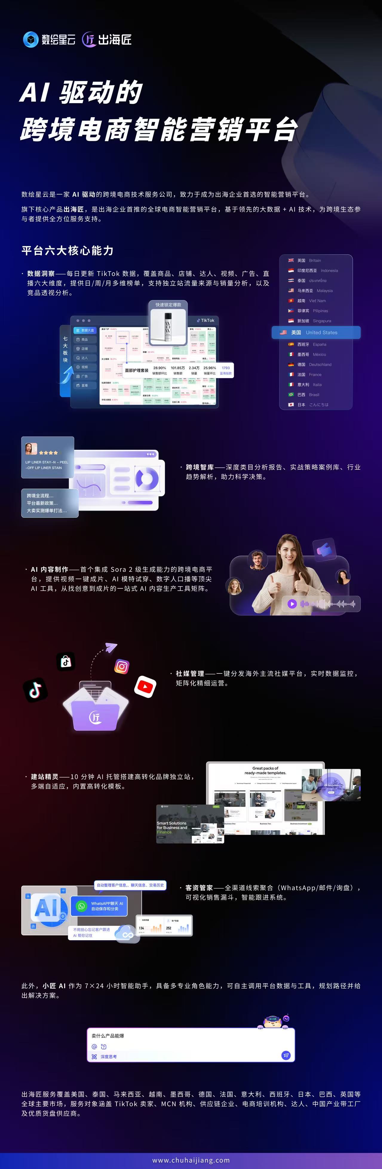 数绘星云是一家AI驱动的跨境电商技术服务公司,致力于成为出海企业首选的智能营销平台。旗下核心产品出海匠,是出海企业首推的全球电商智能营销平台,基于领先的大数据 + AI 技术,为跨境生态参与者提供全方位服务支持。