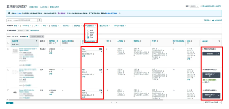 因此,亚马逊建议卖家,及时查看并清理冗余库存,以提升仓储空间利用率并节省仓储成本。那么,如何查看冗余库存呢? 在“亚马逊物流库存”工具中可以针对“预计冗余商品数量”进行排序,从而筛选出冗余库存;并可在右侧“操作”中查看针对每个ASIN所提出的建议。卖家可以结合自身产品市场、业务情况,选择是否采纳建议。