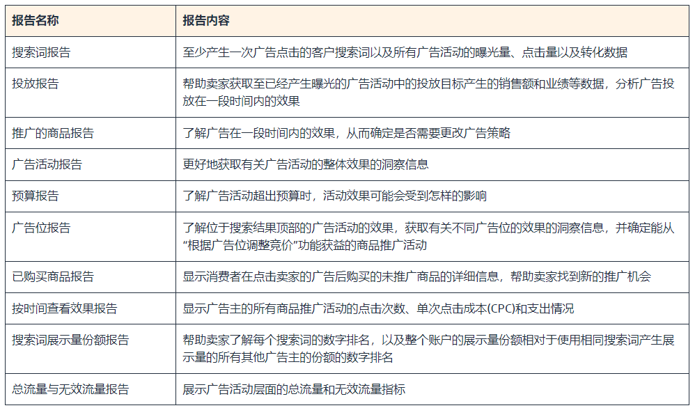 亚马逊商品推广广告包含:搜索词报告、投放报告、推广的商品报告、广告活动报告、预算报告、广告位报告、已购买商品报告、按时间查看效果报告、搜索词展示量份额报告、总流量与无效流量报告10大报告。