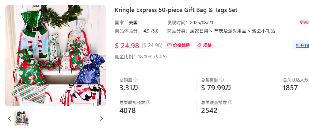 产品以套装形式出售,包含多种尺寸和配色的礼品袋、礼品卡夹及标签,配色鲜艳,适配各类节日场景。产品的最大亮点在于“即装即用”——无需剪刀胶带,放入礼物、贴上标签即可完成包装,极大简化流程。一条直观展示使用效果的短视频播放量近2000万,贡献了约1万件的销量。