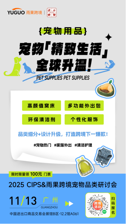 宠物“家人化”趋势持续深化,驱使宠物主愿意为兼具健康管理与情感互动的产品买单。未来,功能融合型的宠物用品将成为跨境出海的新增长点。11月13日,第二届CIPS&雨果跨境宠物品类研讨会将在广州举行,聚焦跨境选品策略与供应链对接,帮助卖家系统把握宠物经济新趋势。立即报名锁定席位,领取宠物展免费门票!