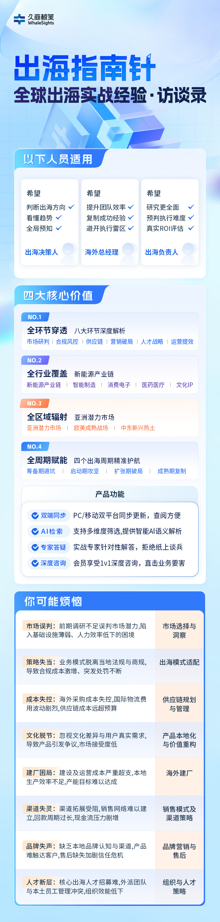 亮点 经验与资源丰富:平台汇聚超 10 万 + 海外实战专家,每月新增百余条出海实战经验访谈录,覆盖企业出海全流程(从选市场、配模式到供应链管理等),且业务覆盖全球 18 个出海热门区域,能为不同行业、不同发展阶段的企业提供全栈实战经验支持。产品功能强大且具针对性:具备双端同步(PC / 移动双平台同步更新,查阅便捷)、智能检索(支持多维度筛选,提供智能 AI 语义解析)、专家答疑(实战专家针对性解答,拒绝理论化)、深度咨询(会员享 1v1 深度咨询,直击业务要害)等功能,能精准高效地满足出海企业各类需求。多维度价值突出:实现全环节穿透(八大环节深度解析市场研判、合规风控等)、全行业覆盖(聚焦新能源产业链、智能制造等五大热门行业)、全区域辐射(覆盖亚洲潜力市场、欧美成熟战场等三大热门出海地区)、全周期赋能(为筹备期、启动期等四个出海周期提供护航),全方位助力企业出海。精准解决痛点:针对市场误判、策略失当、成本失控等八大出海核心烦恼,对应提供市场选择与洞察、出海模式适配等八大话题解决方案,直击企业出海痛点。