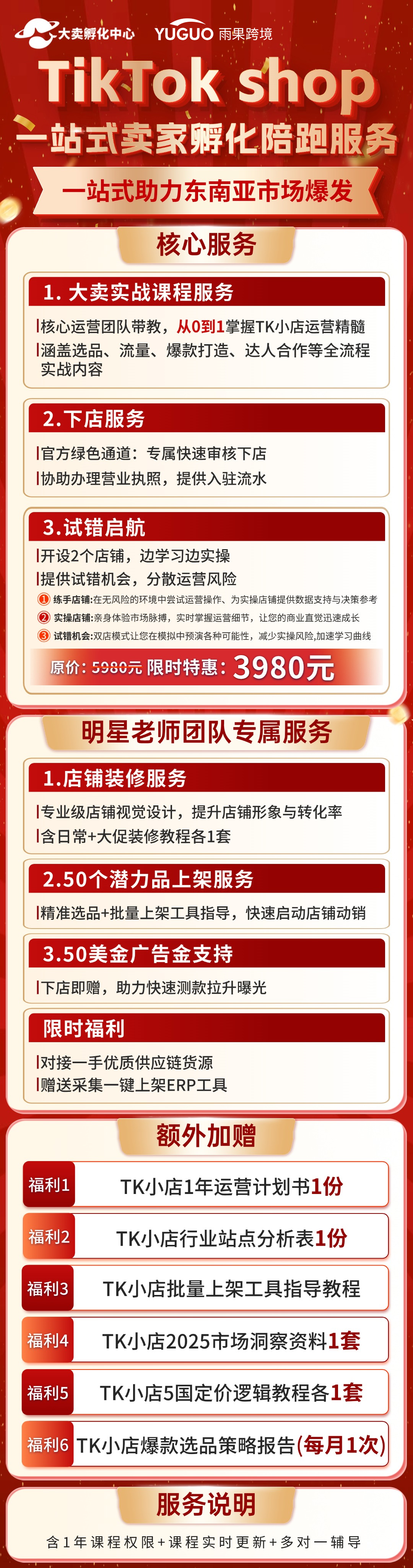 大卖陪跑:美区亿级大卖亲授爆品打法(升级永久陪跑!),定制策略:根据不同客户规划运营策略,实战指导:陪跑期间全程跟踪辅导进阶,能力提升:掌握TikTok美区全链路运营技巧,生态系统:TikTok美区货盘等优质资源对接