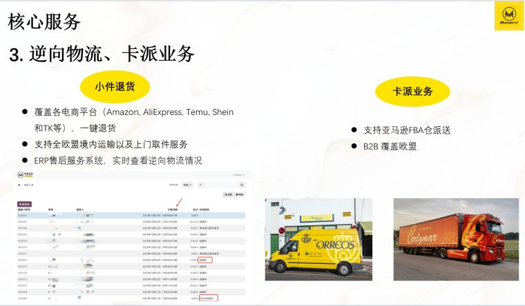 亮点 自研系统,可覆盖欧洲所有国家正逆向物流,退换货处理并出退货标签,上门取件可接大件货性价比高投妥率高