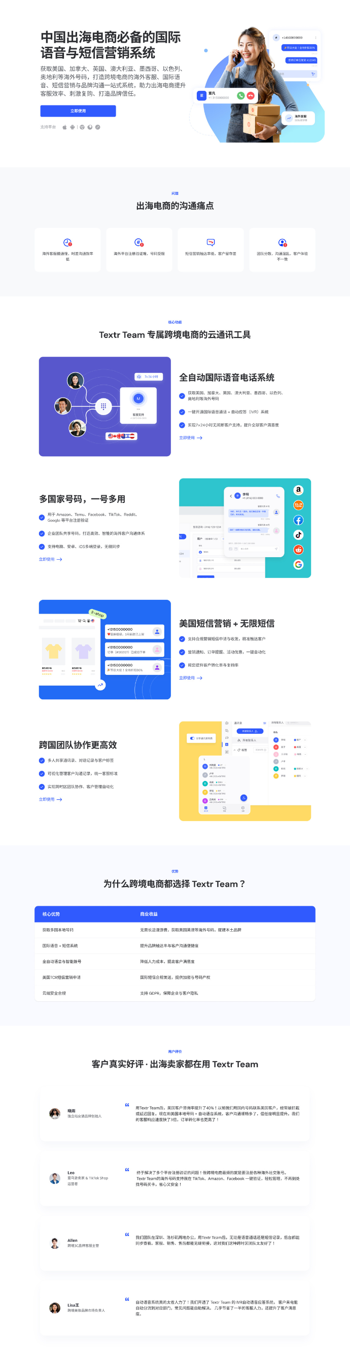 亮点 一键获取美加英澳等海外号码全自动客服应答IVR电话系统美国短信营销备案与无限短信Amazon、TikTok、Facebook等账号注册多端同步,网页与App同时在线
