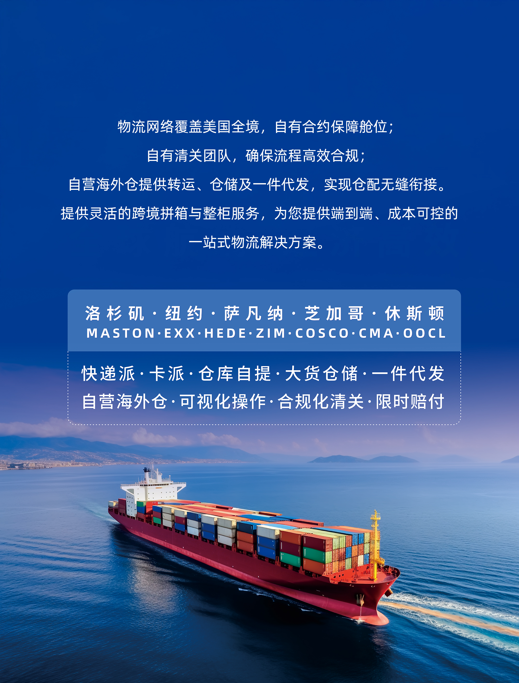 亮点 美国全境网络覆盖自有舱位保障稳定自有清关高效合规仓配一体无缝衔接端到端灵活物流方案 自有尾端派送账号 当天提柜拆柜上网