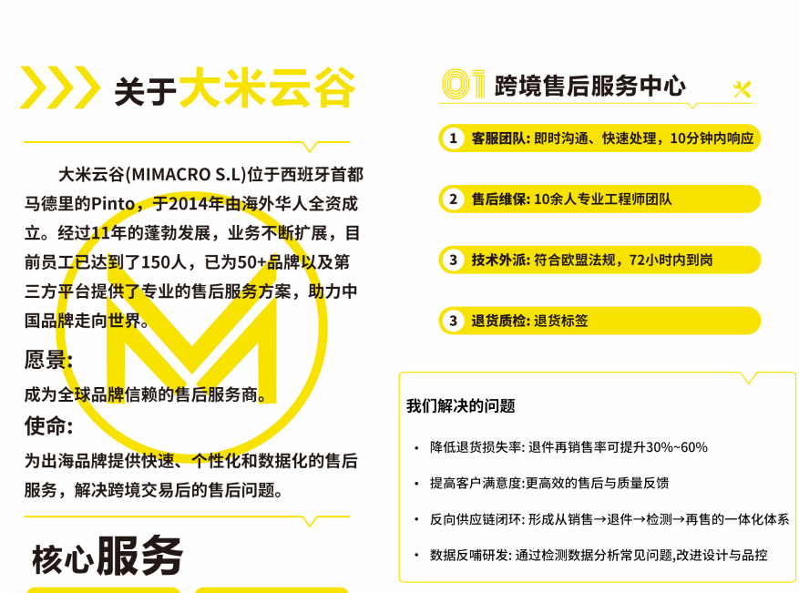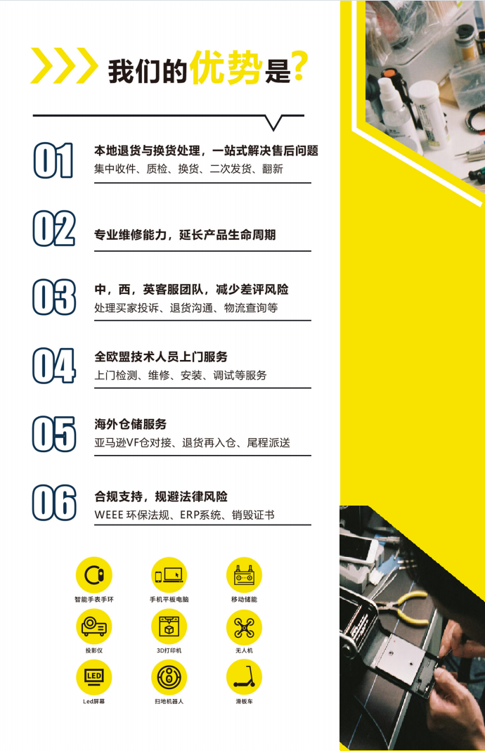 亮点 退件质检接受跨境电商批量退货降低诈退率20%10余人专业工程师团队维修良品率70%为售后客户定制SOP技术人员可以全欧盟派驻快速响应72小时内到岗灵活调配中西英三语客服团队即时沟通、快速处理