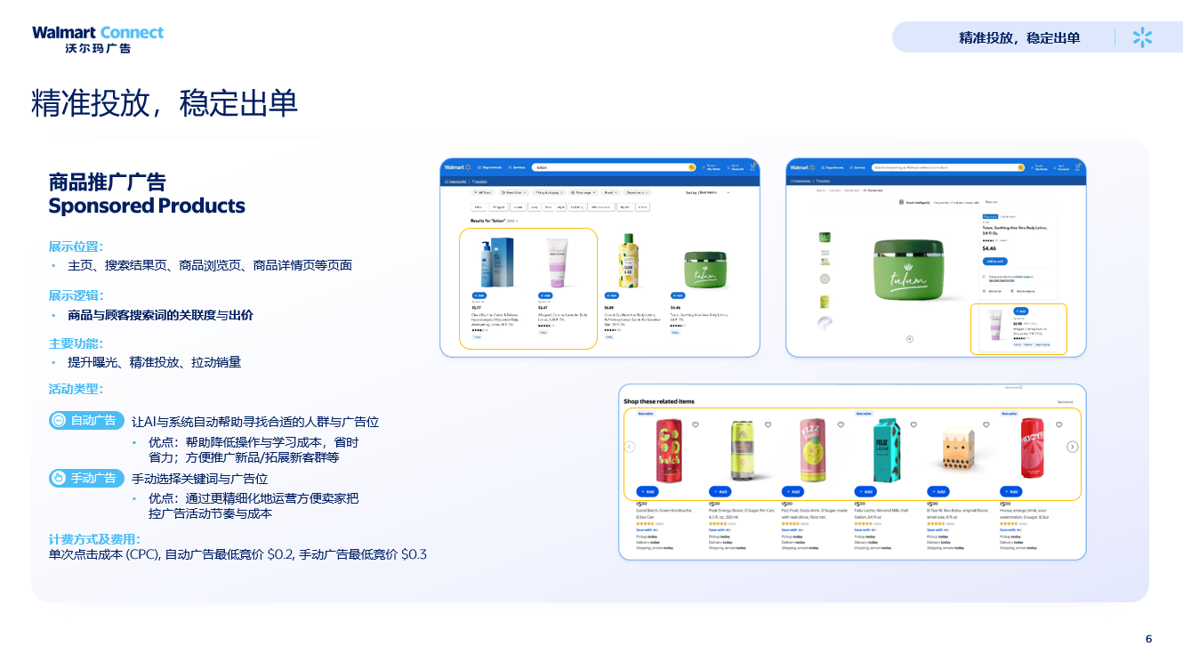 商品推广广告能将商品精准展示给在沃尔玛网站和 App上主动搜索相关关键词的顾客。该广告出现在搜索结果和商品详情页等关键位置,帮助消费者轻松发现、点击并购买,从而有效提升转化量和销量。