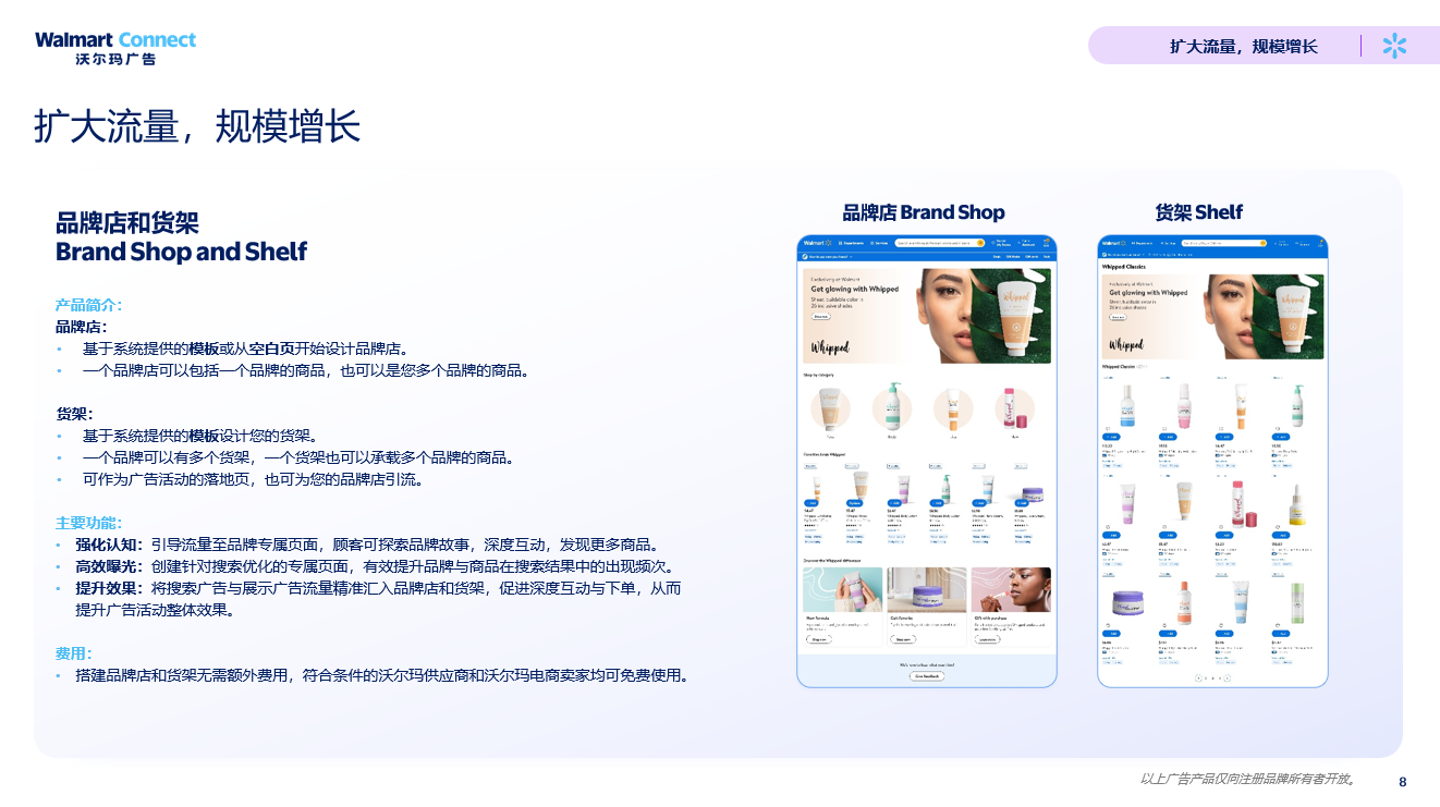 品牌店是沃尔玛网站上的虚拟门店,货架是可购物的定制化落地页,用以支持各类媒体广告活动。该广告面向符合条件的沃尔玛供应商和沃尔玛电商平台品牌所有者开放。